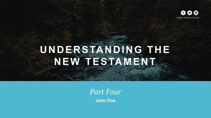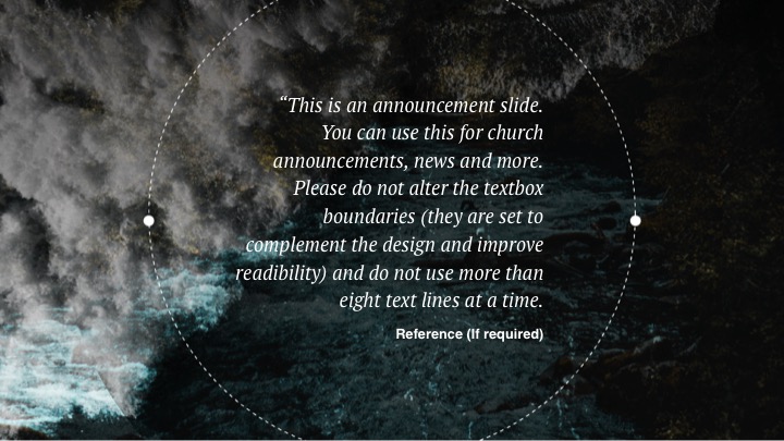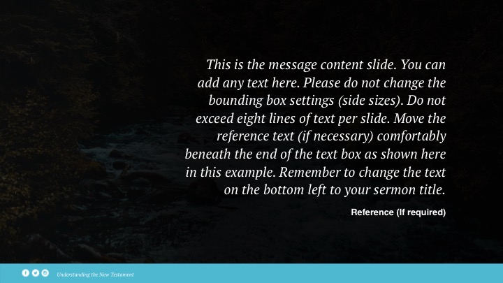 3. For the announcement and message content slides. Please do not change the bounding box settings (side sizes). Do not exceed eight lines of text per slide. Move the reference text (if necessary) comfortably beneath the end of the text box as shown here in the example. Remember to change the text on the bottom left to your sermon title. Don’t worry if you don’t have a lot of text. One or two lines will do as well. You don’t always have to have a reference either.