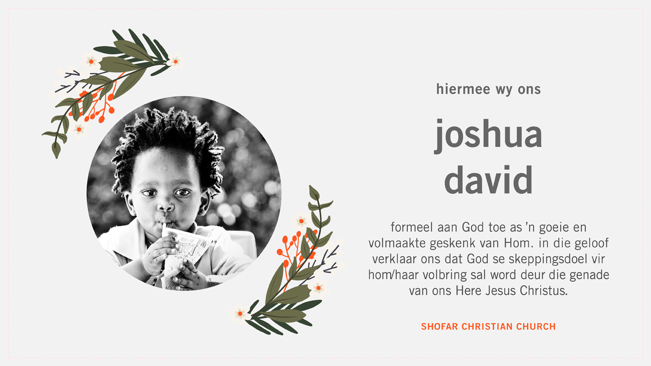 Customisable slide in English or Afrikaans for your baby dedication service. Available for standard and widescreen projectors.